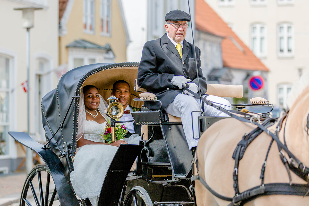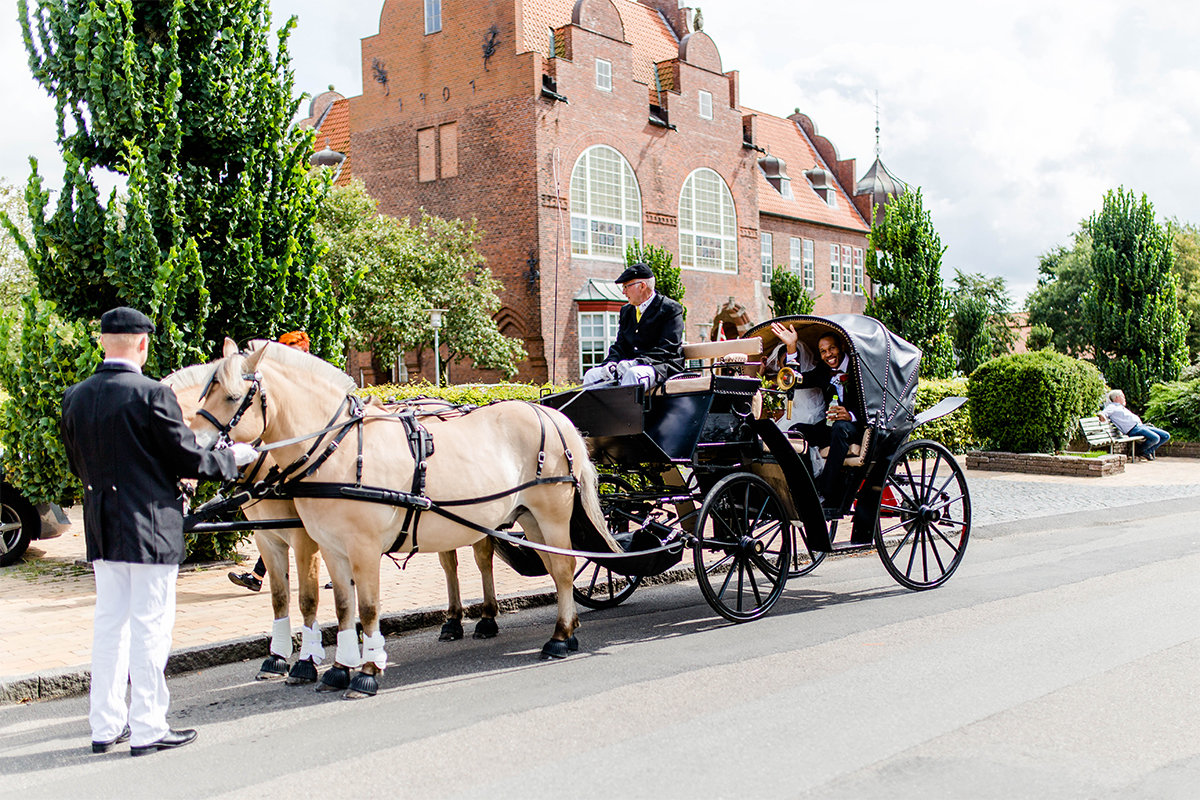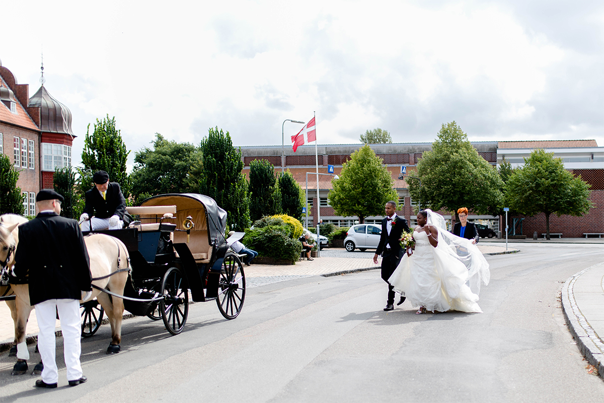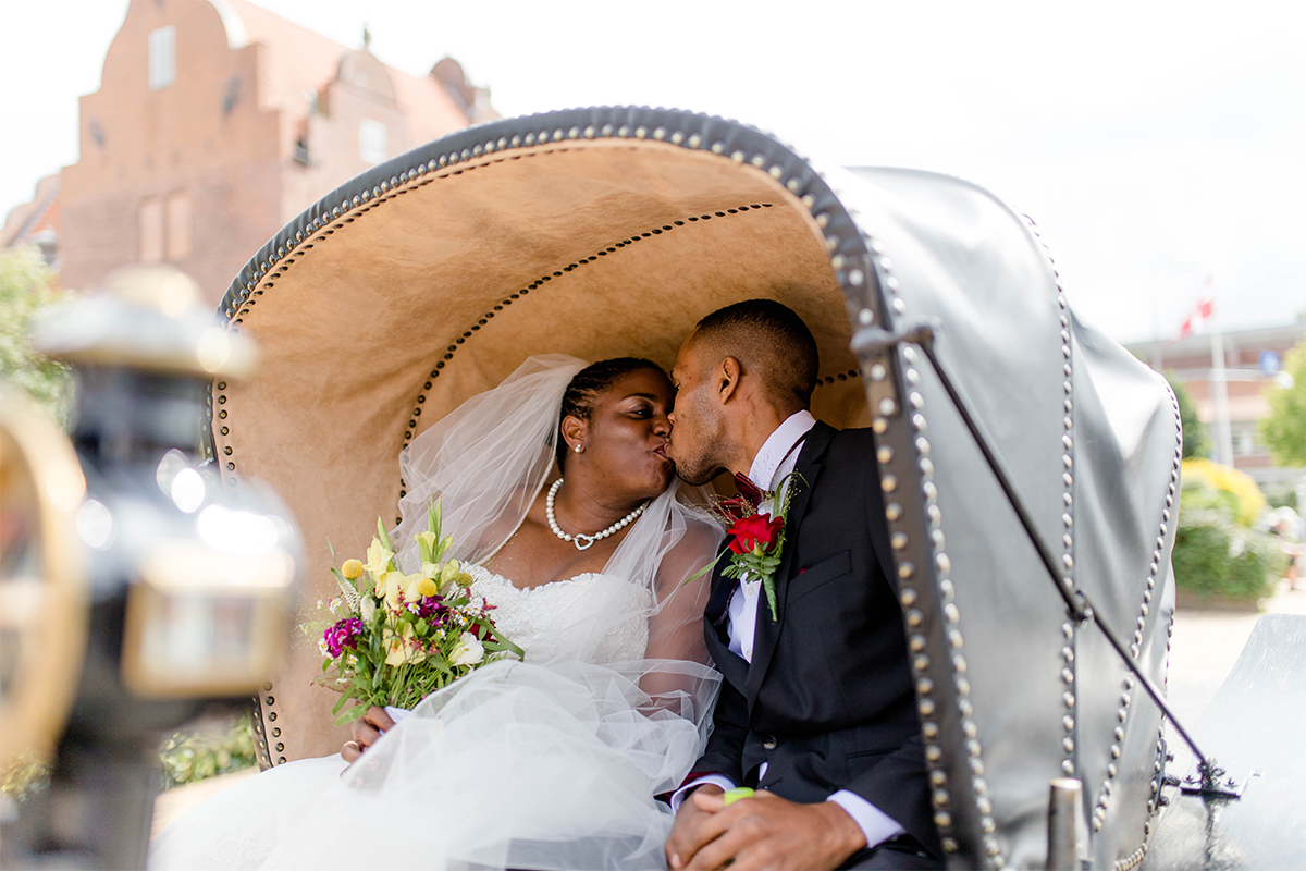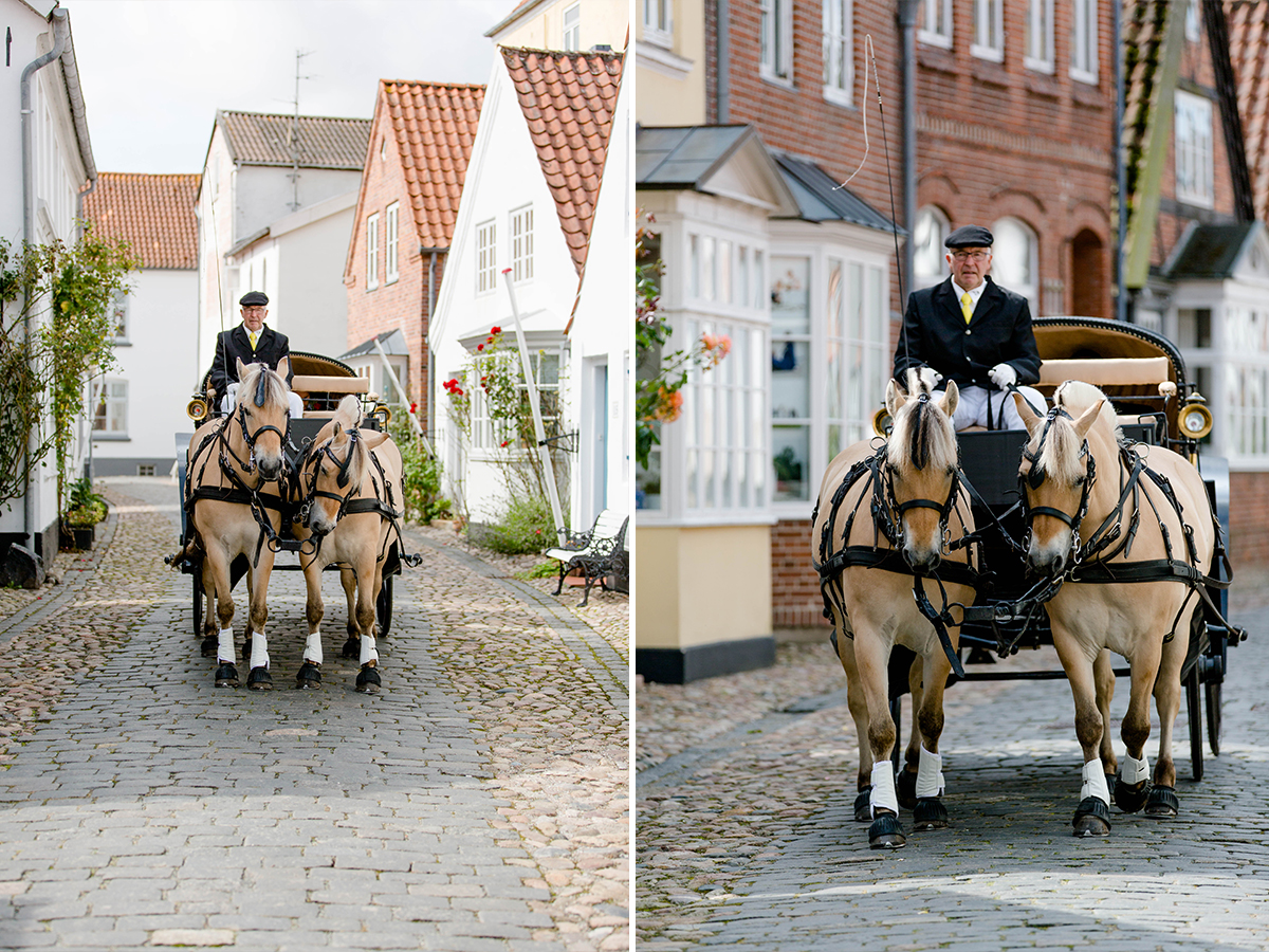 Die Hochzeit, die ich euch hier zeige war großartig. Nach vielen Regentagen haben wir einen warmen und sonnigen Tag erwischt. Gemeinsam mit YES I DO sind wir zum Hotelzimmer des Brautpaares gegangen und haben festgehalten, wie Braut und Bräutigam sich für ihren besonderen Moment zurecht gemacht haben. Um das Brautpaar vom Hotel zur Trauung zu bringen, haben YES I DO eine Kutschfahrt durch Tondern organisiert. Ok, an dieser Stelle wurde es bei einem sonnigen Augusttag etwas anstrengend…., denn wir sind nebenher gelaufen zum Fotografieren. Da auch noch Tondernfestival war, gab es kaum eine Möglichkeit mit dem Auto vor zu fahren, denn die meisten Straßen waren gesperrt. Aber die Bilder, die dabei entstanden sind, halten unvergesslich schöne Momente fest.